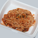 спагетти, лук репчатый, фарш, томатный соус, зелень.